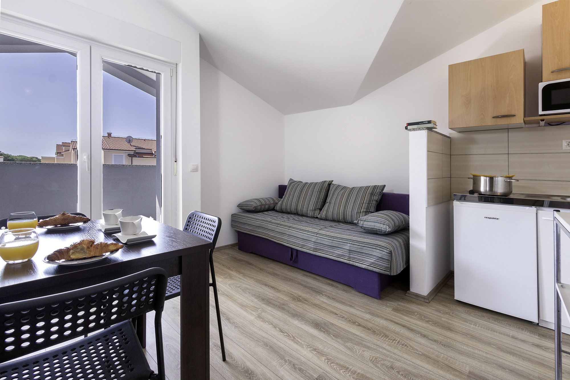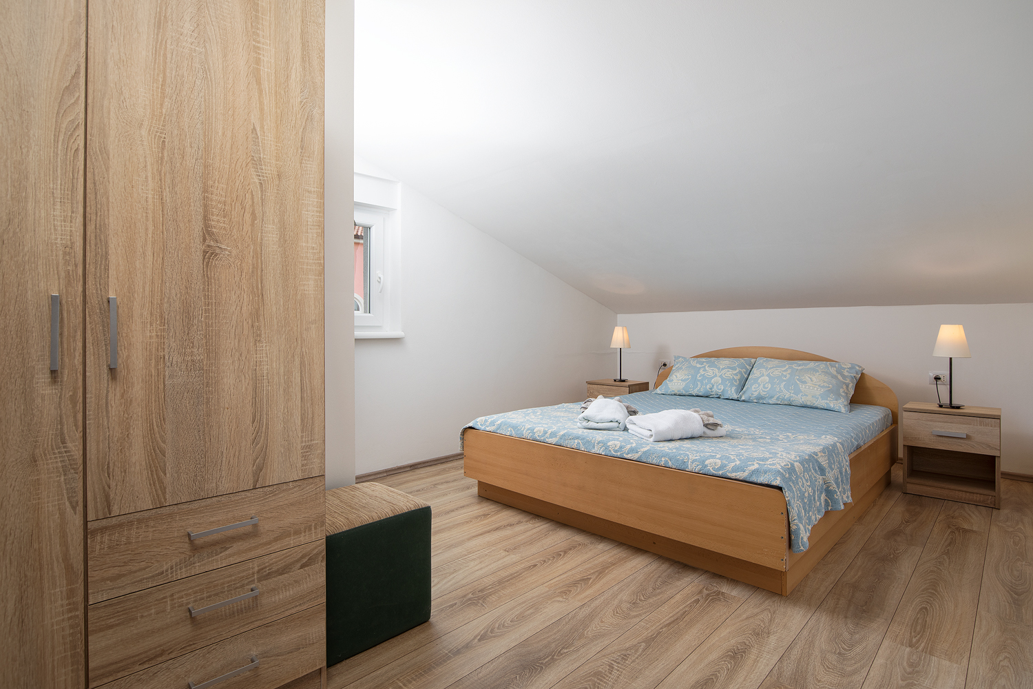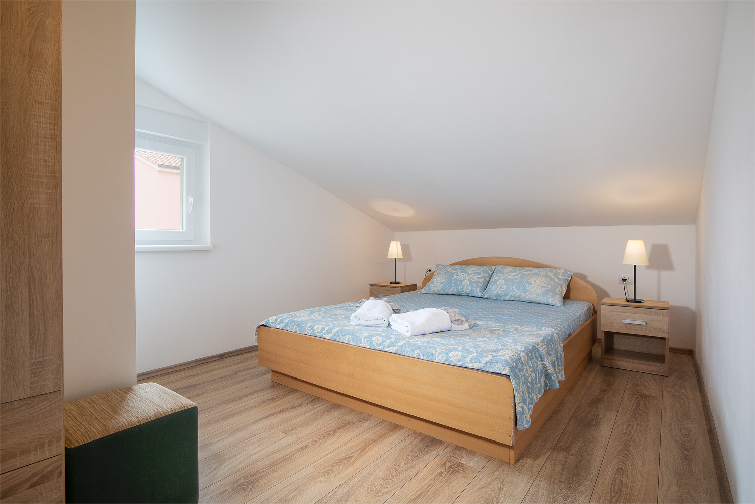 The apartment consists of a bedroom with a double bed (1,60x2m), a living room with a sofa bed (1.50x2m), a small kitchen, a bathroom and a terrace. The kitchen is equipped with a refrigerator, microwave oven, a cooktop, toaster, cafeteria (Mocca) and a watter cooker. The apartment is air-conditioned, has an LCD TV with satellite and domestic programs, and a parking space is available. Wireless Internet access (Wi-Fi) is provided, bed linen is included in the price and is changed once a week, as well as two towels per person. The sandy beach of Bijeca is only 500m away, and nearby there are organized pebble, rocky and concrete beaches.