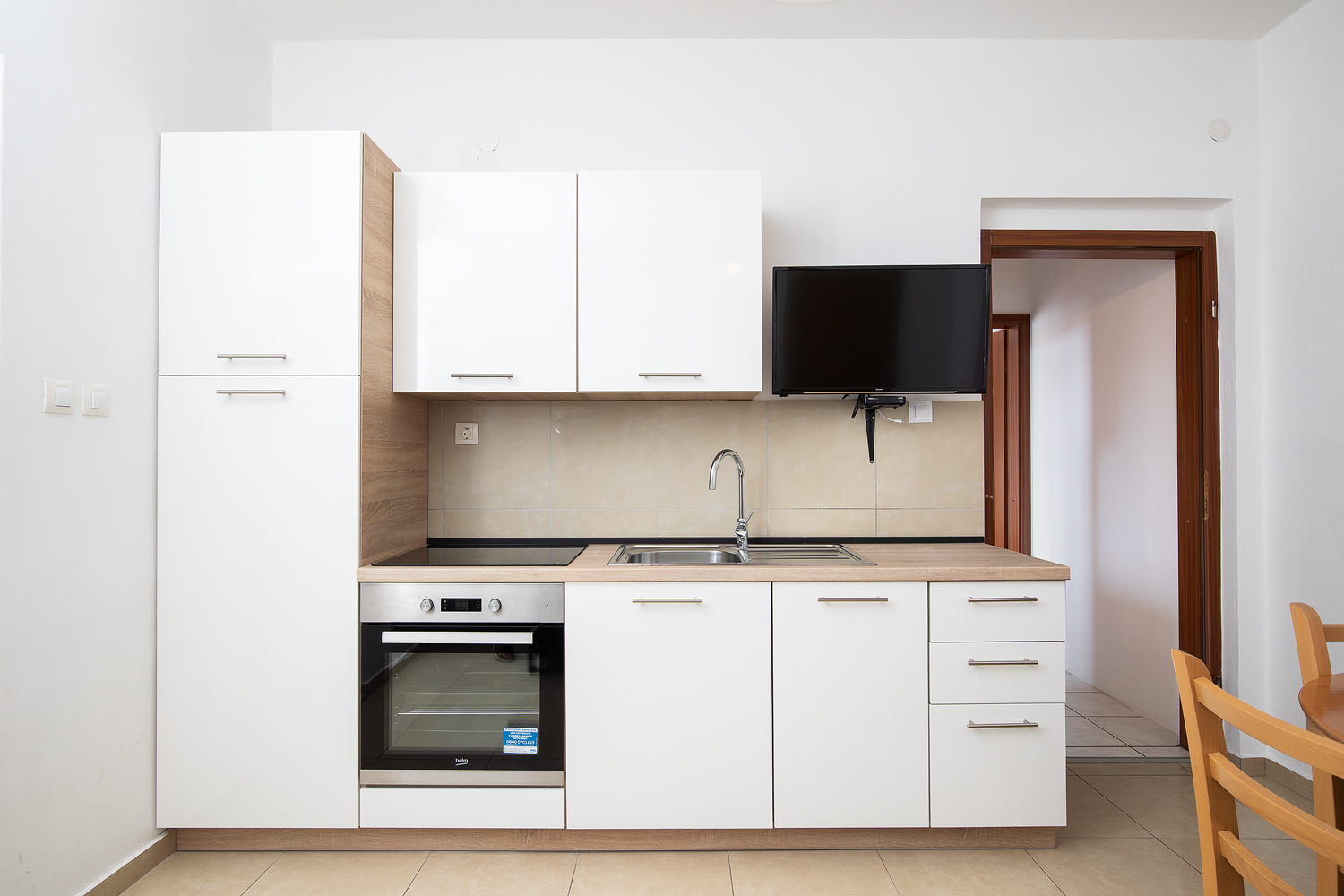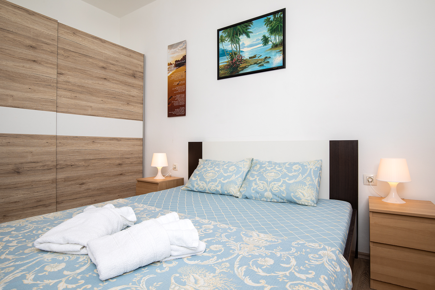 This apartment has ensured 2 parking places. The sandy beach Bijeca is only 500 meters away. There are also rocky and pebble beaches nearby.